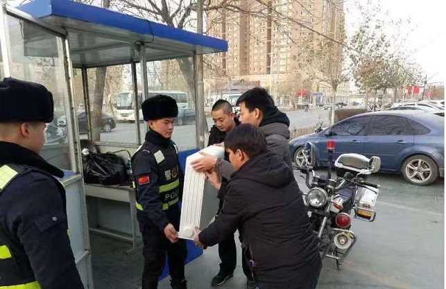 “孟书记、热合曼主任,真是太感谢你们了!长期以来你们有求必应,对我站工作人员关心关爱,设备还没有热起来但是我们的心里已经热了”。当一杆旗社区党支部书记孟容和居委会主任热合曼•艾买提将采暖设施送到执勤点时,便民警务站站长感动的说道。