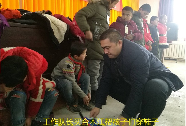刚进校园,孩子们便主动上前欢迎驻村工作队一行,在校领导的陪同下,在孩子们热情洋溢的欢迎声中,驻村工作队为孩子们送上了节日礼物——棉衣、棉鞋。工作队队长、第一书记买合木江.依米热木孜为家庭生活困难的孩子穿上御寒的棉衣、棉鞋,在这天寒地冻的时节,孩子们穿上了新棉衣、新棉鞋,瞬间,心里温暖了,高兴的手舞足蹈,个个露出了天真、可爱的笑脸。