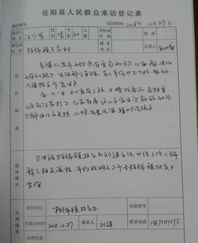 清风网岳阳讯( 徐亚平 张脱冬 甘治国 任福阶 许萍)12月27日,风雨交加,寒气刺骨。笔者到岳阳县扶贫办有事,看见203办公室坐着一位愁容满面、身穿旧棉袄的老人,饮着一杯热茶,向该室的女办事员余幼蕾诉说自家的情况。