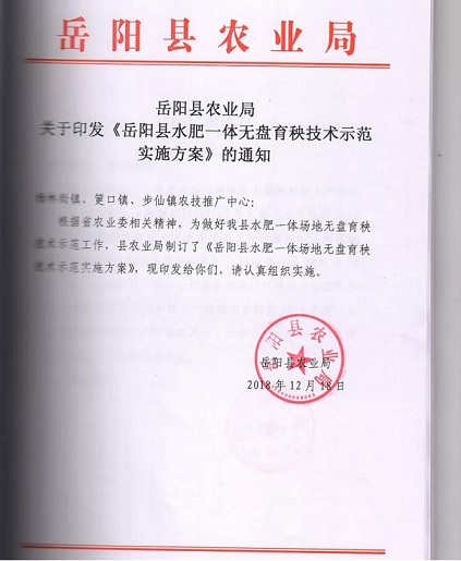 岳阳县及早部署 2019年水稻水肥一体化场地无盘育秧技术示范工作
