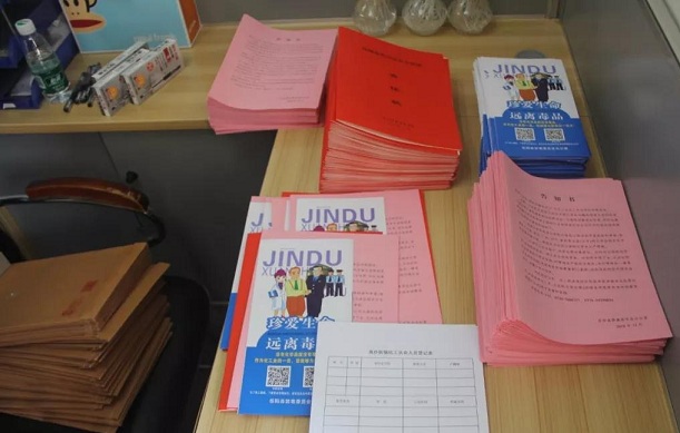 12月16日-19日,工作组深入以东莞市政欣化工科技有限公司为代表的在莞岳阳县籍易制毒化学品经营企业,因地制宜地利用该厂的办公场所、电视、显示屏、橱窗、展板等宣传设施,开设易制毒化学品管制宣传专栏,全方位、全天候地向易制毒化学品从业人员静动态展示禁毒知识,尤其在厂区的重要区域、显要位置悬挂标语、发放资料、公布举报方式,充分发动广大从业人员参与拒毒、防毒、禁毒,营造“人人知晓、个个参与”的宣传声势。