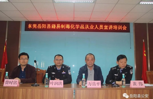岳阳县公安局党委委员、副局长万岳平、黄沙街镇党委副书记、镇长费时铭出席会议,东莞市公安局禁毒支队教官叶润洪作专题讲课,在莞岳阳县籍易制毒化学品从业人员代表236人参会。