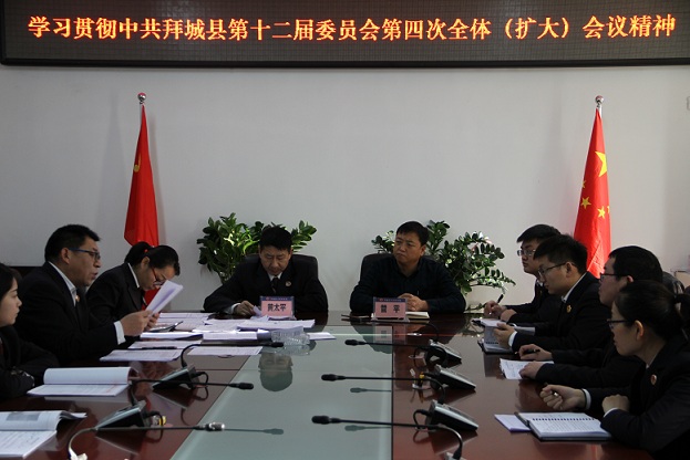 院党组书记黄晓明向全院干警全文传达学习了县委书记彭刚同志在拜城县第十二届四次全体(扩大)会议上做的《振奋信心、勇于担当、真抓实干,坚定不移贯彻落实党中央治疆方略,奋力开创拜城社会稳定和长治久安新局面》主题报告。