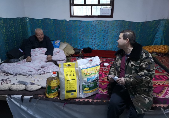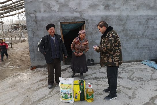 一大早工作队队员先后来到来6组困难群众尼亚孜汗·克比尔、3组艾则孜·肉孜和苏莱曼·吾斯曼等25户困难群众家中为他们送去了大米、面粉和食用油生活用品。每到一户,工作人员都与他们亲切交流,详细询问了解了他们的身体状况、医疗保障和生活情况,耐心倾听他们在生活中的困难、问题等情况。