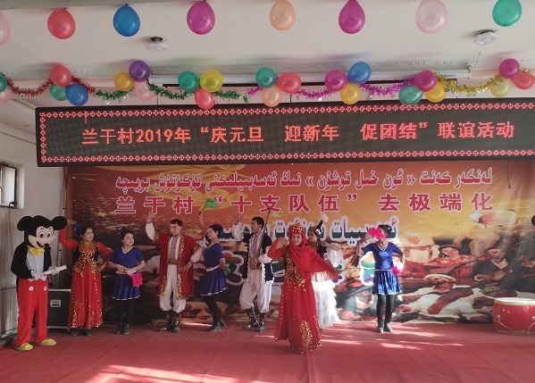2018年的最后一天,拜城县察尔齐镇兰干村的村民在村委会举办了“庆元旦、迎新年、促团结”喜迎2019年新年联欢晚会。乌鲁木齐海关驻村工作队和村两委安排布置、组织、策划、编导排练了一台高质量的文艺节目。这台节目既具有民族特色又富含现代气息,同时,通过配乐诗朗诵、小品,将五个认同教育、去极端化教育以群众喜闻乐见的形式进行传播,使群众在欢声笑语中受到洗礼,唤起了全村村民学习国语的高潮。起到春风润雨细无声的效果。
