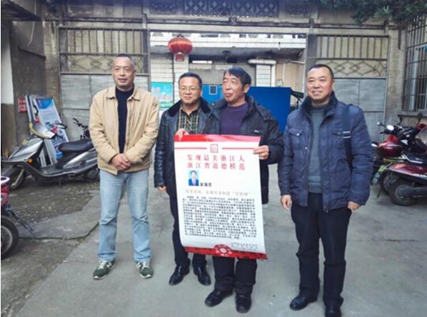 图:县委常委宣传部长、县文明办主任一行将最美浙江人红榜送吴强忠手上