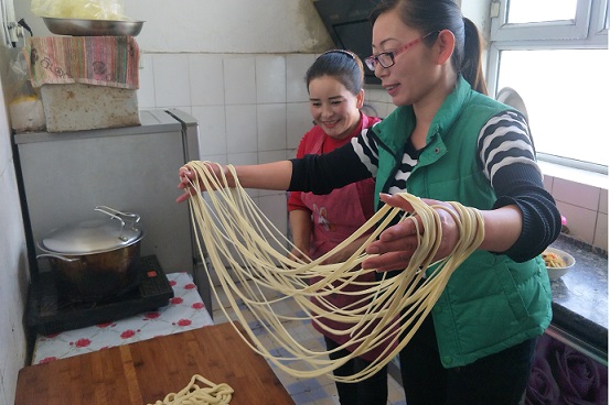 以后每次家里搓拉面布沙热木·尼亚孜都会邀请我与她一起做,她说:“我教你搓凉面,就要对你负责,非要让你练到跟我们维族阳刚子一个水平”在她的一次次热情的带动下,我也改变了原来随便学学的想法,不知不觉间我不仅跟布沙热木·尼亚孜学会了搓凉面还也学会了跳美妙的麦西来甫,从她那里感受到了勤劳、善良。是住户结亲让我有缘与村民结为亲戚,让我们彼此走进了对方的世界,从陌生,到了解,到彼此的内心深处凝结成最牵挂最朴素的感动……