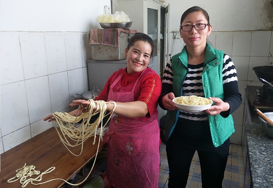 半下午,布沙热木就喊我开始和面。“面要提前两小时左右和好,面醒够时间才能做面积子,抹上清油再醒一会才能搓,这样面会更劲道、口感好,搓面时,手掌要用力均匀,保持粗细一致……”热情的布沙热木·尼亚孜手把手认真的教我,可是看着面在她手上游刃有余,而在我手上就特别不听使唤,不是粗细不均就是一折再断,好不容易搓了一段,可是在往手臂上缠绕时又夭折了,“面条子不能只在手掌上缠绕,要把手腕伸平,面条均匀摊开,甩面要找准用力点,这样下锅既保持面条粗细均匀还不粘连…….”终于在她耐心细致的指导下我笨拙的双手学会了搓凉面,虽然搓的粗细不那么均匀,但收获的喜悦让我感到特别满足。