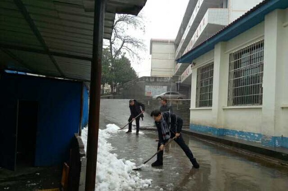 寒雪知严冬,模范看党员。为了保证雪后正常上课,消除校园安全隐患,该校党支部组织全体行政领导及部分党员教师,在1月3日-4日两天里,全面排查校内安全隐患,铲除校内路面、台阶上的积雪。大家分组分工,齐心协力,积极投入到清除积雪的行动中……为学生行走消除隐患、提供安全保障。