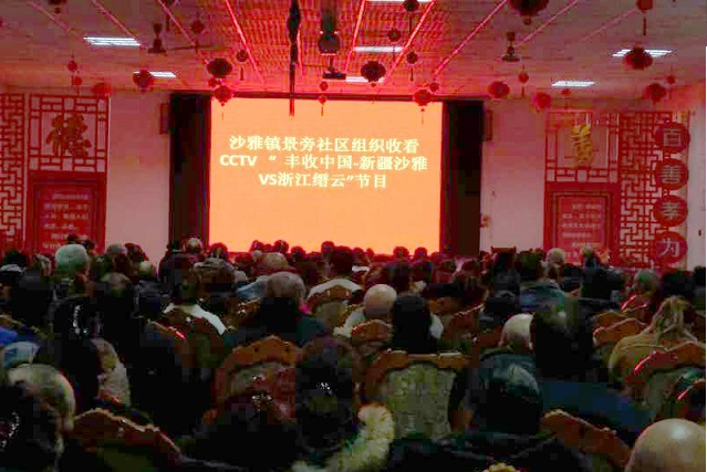 清风网讯 (通讯员:沙雅县景旁社区访惠聚工作队 赵慧芳 热汗古力·米吉提)1月5日下午18:05,由CCTV_7《乡村大世界》栏目录制的《丰收中国年(四)-“沙雅VS缙云”》电视节目正式播出,景旁社区组织社区干部、驻村工作队员、各族群众370余人观看了本次节目。