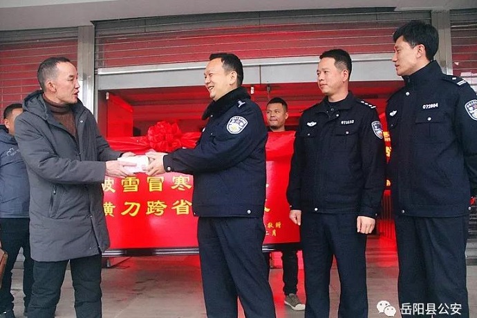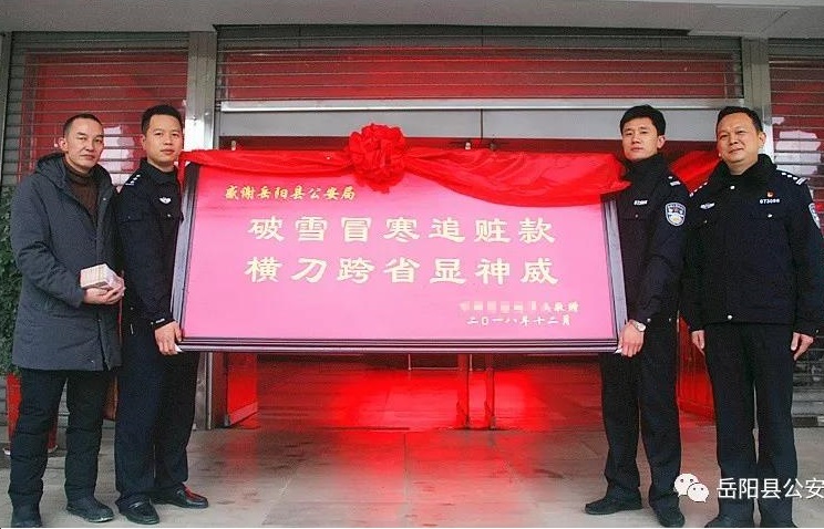 清风网岳阳讯(陈斯 许萍) “感谢一心为民的岳阳县警方,万万没想到你们能将赃款全部追回。年底了,员工都盼着我发工资、奖金呢。谢谢你们为我解了燃眉之急!”2019年1月8日,岳阳县某公司老总胡先生率队到岳阳县公安局赠送印有“破雪冒寒追赃款,横刀跨省显神威”字样的牌匾,以表谢意。该局党委副书记、政委陈遇春代表本局接受牌匾,并将10万元赃款全部退还到胡先生手中。