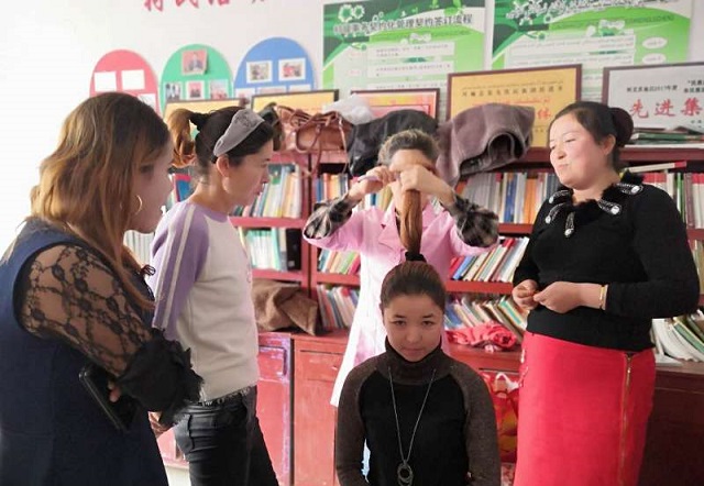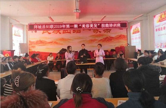 清风网讯(拜城县妇联:米热宛古丽•艾肯木)2019年1月7日,拜城县妇联在本单位访惠聚驻村点拜城县康其乡和谐村举办为期5天的美容美发培训班,全乡60余名妇女群众参加。培训班专门邀请拜城县拉丽热汗婚纱摄影店经理、专业的美容美发师热汗古丽•毛尼亚孜通过现场理论教学结合实际操作,为妇女群众系统的讲解日常妆容、基础美容化妆、盘发等技能,使系统的美容美发知识变得浅显易懂,确保每一名学员都能领会。
