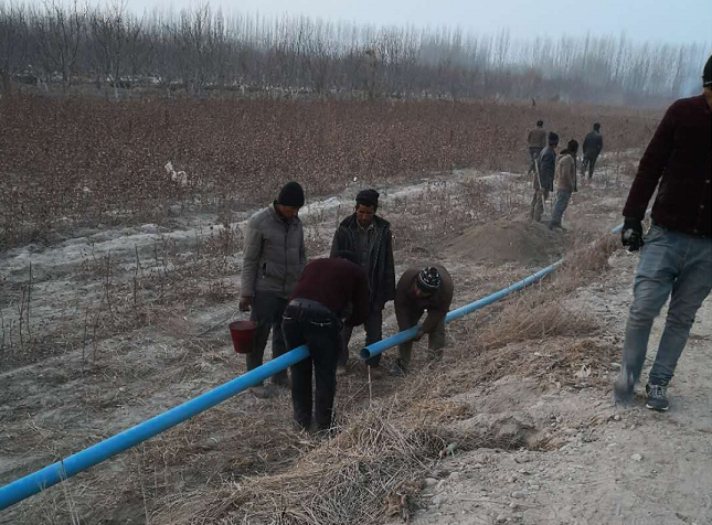 在村委会未动员的情况下,有将近70名村民自发组织前往现场,各有分工,有的村民破土挖沟,有的村民驾驶拖拉机马不停蹄地拉土,大家齐心协力,终于在1月14日23:16分将冻裂的将近300米输水管道全部更换完毕。当施工现场传来村民“家里有水了!自来水通了!”的电话声时,大家欢呼起来,高喊道:“工作队亚克西!吐书记亚克西!”站在一旁的吐尔洪·亚森书记开心的说:“终于有水了!工作队为村民解决了大问题!”