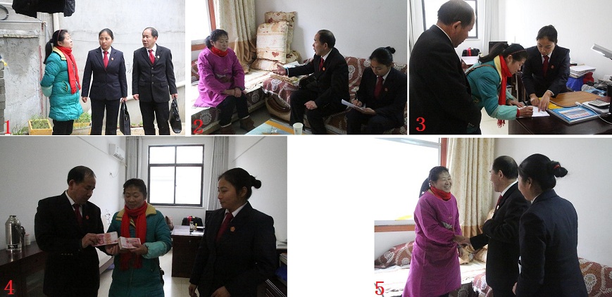 图1为法官到原告家现场调查。图2为法官和原告通过沟通。图3为原告在协议书上签字。图4为原告从法官手中现场领取其中的2万元赔偿款。图5为原告向法官握手致谢。