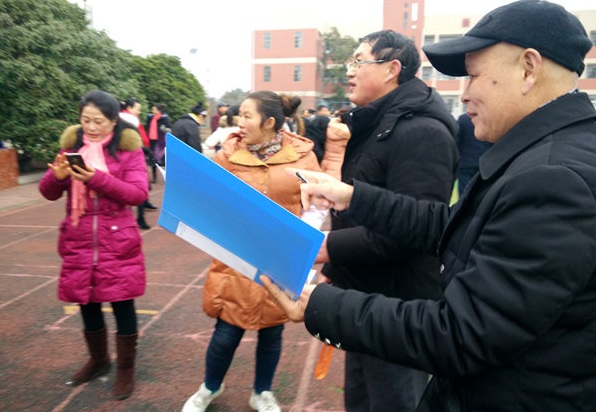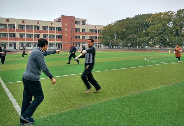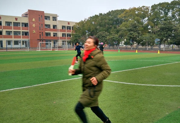 下午3点钟,温度虽然很低,该校操场一片火热。全体教职员工被颇有节奏的进行曲召集来到学校操场,接力赛就要开始。有的弯腰压腿,有的拿起接力棒沿着赛道一阵小跑,做起赛前热身运动来。有的工会组长开始召集本组成员,讨论比赛策略。