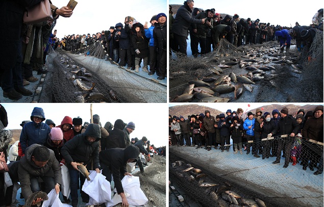 冬捕节是北方寒冷冬季最盛大的节庆活动,扎兰屯市是蒙古、鄂伦春、鄂温克、达翰尔等四少民族聚集地,扎兰屯市至今还保留着冬季捕鱼的传统,据了解,每年临近春节,便启动这一古老的冬捕方式。扎兰屯市卧牛河镇靠山水库生长着鲤鱼、草鱼、花鲢、胖头鱼、鲶鱼等鱼类。在冬捕现场,首先举行了传统祭河神仪式,随后,渔工们开始了收网,四五米宽的大网裹着冰层下的鱼儿从冰上的出鱼口缓缓露出冰面,这是现场人最激动人心的时刻,渔工们一边收网,一边将打上来的鱼平摊在冰面上,人们兴高采烈地将各种鱼装入袋中,并与新鲜活鱼亲密接触,并乐在其中,尽情体验冬趣、冷趣、鱼趣和地道民族风情。同时,现场还进行了头鱼竞拍活动,人们涌跃参加,头鱼很快被一名游客拍走,抢到了“好运好彩头”。