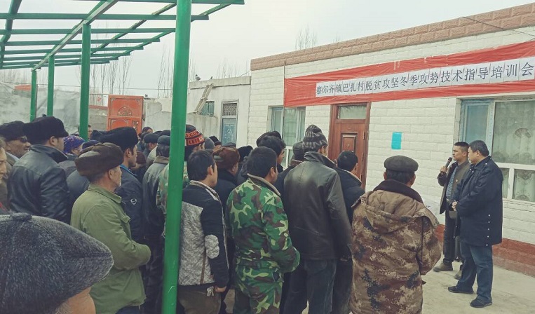 2019年1月22日,察尔齐镇巴扎村联合党支部在村民1小组36号贫困户阿布都肉苏力·阿布都瓦力家组织了“冬季攻势技术培训”现场会,巴扎村全体19户贫困户及50位村民参加了现场培训。村党支部书记卡哈尔·居曼、镇扶贫办主任金栋作了会前讲话,村扶贫干事邀请镇兽医站和林管站的同志为大家具体讲解了牛羊的科学养殖,牛饲料、羊饲料的科学配方,果树的修剪,以及大家平时遇到的问题进行现场交流解答。然后培训人员带领大家在模范贫困户家中进行了现场观摩演示。最后扶贫干事把这些实用的小技术用双语预先打印成了宣传单,让村民带回家学习使用。