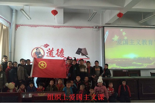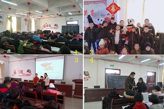 1、返乡大学生化雪峰在辅导孩子作业 2、合照 3、开展少先队员课程 4、书记在询问小同学的学习