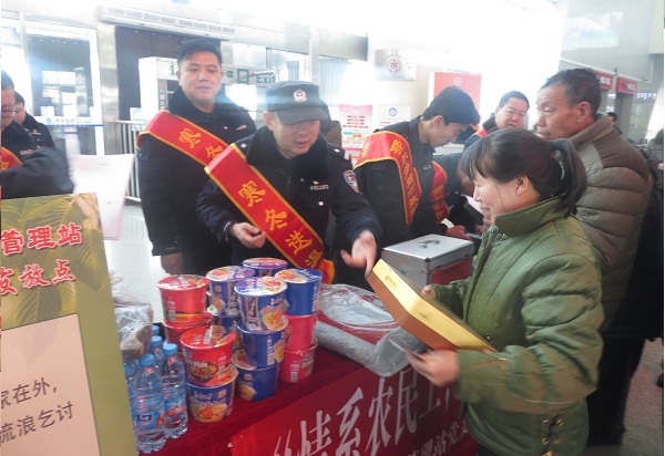 活动中,民警与鄂尔多斯救助管理站的员工一同向旅客群众发放棉衣棉裤、保暖内衣、“救助爱心餐”等物品。通过摆设宣传展板、现场讲解、发放宣传单等形式,向旅客群众普及春运期间寻求救助的方法途径。