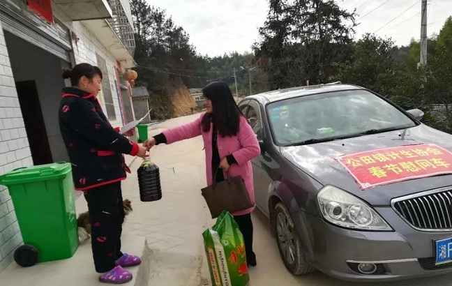清风网岳阳讯 ( 胡凯 谈宇锋 许萍) 新春佳节来临之际,为更好的服务公田镇计生特殊困难家庭,让他们感受到党政府的温暖与关怀,切实提高计生特殊困难家庭的生活质量与幸福指数,让计生特殊困难家庭都能过上一个温暖幸福的春节。1月24日,公田镇卫计办开展“慰问计生家庭户,真情关爱暖人心”生育关怀慰问活动。公田镇卫计办全体干部、公田镇全体村专干共同走访入户,给公田镇90位计生特殊对象送去了米、油等慰问物品,以及春节真挚的问候与祝福。