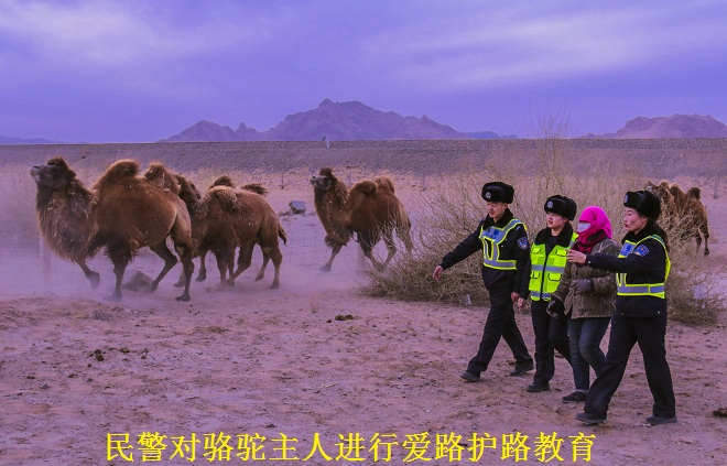 1月28日,是北方传统的小年,春运正在进行中。派出所接到护路员报警称,在线路上发现一群骆驼,距离铁道很近,已经可能影响到列车运行安全。三名青年民警赶赴现场后,发现约有30多峰骆驼就在铁路边上。此时距离下一趟车达到附近只有10分钟左右,如果不尽快将骆驼驱赶到安全地带,列车到达后骆驼受惊,不但民警们自身可能被慌乱的骆驼冲撞受伤,更重要的是极易威胁到列车行车安全。民警们迅速在路边捡拾石头、树枝等,大声吆喝着将驼群往线路反方向驱赶,眼看列车快要经过了,民警们总算成功将驼群赶至安全界限外,这时才看到驼群主人从远处赶来。民警们对她进行爱路护路教育,看到她将驼群带走,才放心地驱车回所。