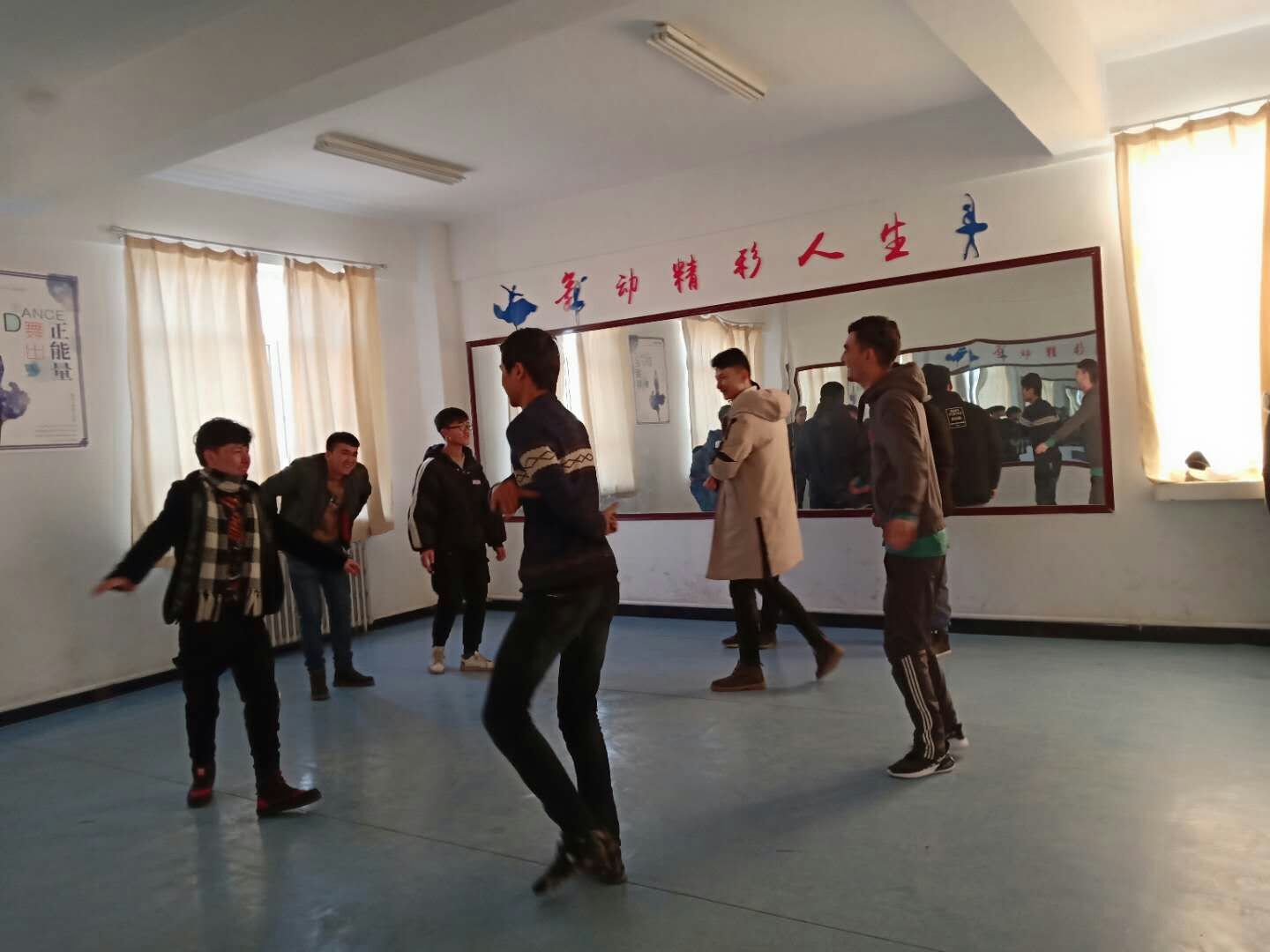 于1月28日上午,在光明社区进行庄重的升国旗仪式后,大学生都留下来自愿组织民族团结的活动。汇聚于舞蹈室内大家一起跳起了“买西来普”。有利于丰富民族团结一家亲的活动,促进各族人民的情谊相互了解相互帮助,在大学生的组织下舞蹈室有专门跳舞的大学生教他们跳舞蹈,感受不同民族风味。这边漂亮的姑娘们在一起跳起了“祖国万岁”中国风舞蹈。大学生说:学习一个新的舞蹈,刚开始都是困难的,但有专业的跳舞的大学生指导我们,让我们有信心学好舞蹈,更加充实自己的寒假生活。