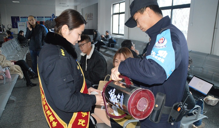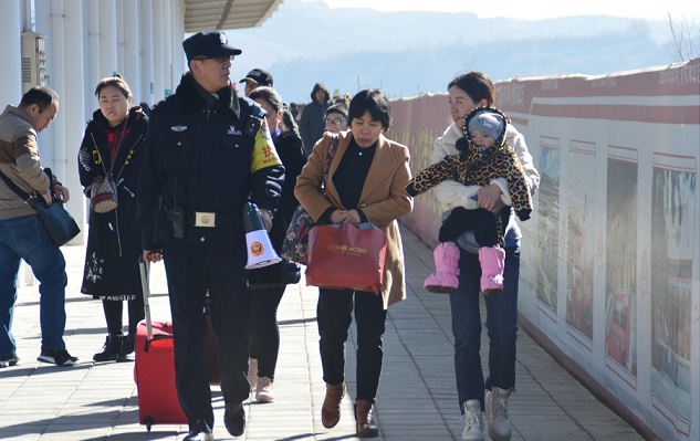 除了出行常识外,民警柳红红还在候车室开展便民服务,对旅客提出的询问一对一讲解,拿来开水和纸杯给没有携带水杯的旅客送上一杯热水,驱走身体里的寒气,温暖出行旅途;另一路民警走上站台,为携带行李较多的旅客、老人,以及带小孩的旅客提供帮助,维护列车乘降秩序,引导旅客有序乘车,为辖区2019年铁路春运营造了一个平安、温馨、便捷的开局。