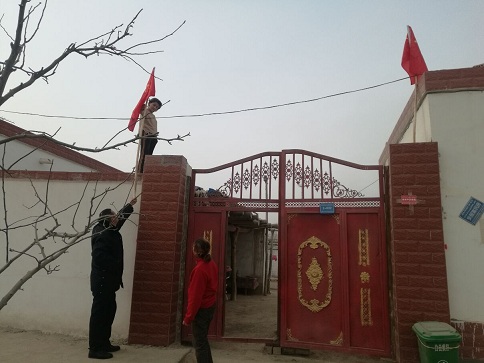 一大早,工作队一行拿着国旗来到党员布尼亚孜汗·热合曼家,将国旗交到布尼亚孜汗·热合曼手中,迎着朝阳,大家携手将国旗挂在大门的两侧。看着迎风飘扬的国旗,布尼亚孜汗·热合曼激动地说:“春节马上就到了,工作队为我们送来了春联、灯笼和国旗,今天工作队干部和我一同挂国旗,我心情特别激动。作为一名农民党员,我一定发挥一名党员的先锋模范作用,维护社会稳定和民族团结,只有祖国强大了才会有我们今天的幸福生活。”