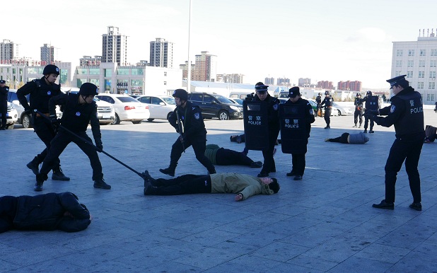 演练预设情景为4名男子在锡林浩特车站站前广场突然持刀疯狂砍杀无辜旅客,值班民警通过视频监控发现后,立即通过对讲机呼叫值勤民警及值班辅警携带反恐装备赶往现场,同时上报所领导。派出所即刻启动反恐应急预案并且通报路地联勤办公室,锡林浩特市特警大队与锡林所民警组成抓捕组共同前往现场进行处置,快速制服持刀行凶犯罪嫌疑人,恢复火车站正常秩序。