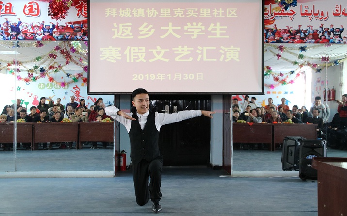 文艺汇演首先由社区党支部书记陈静向全体来宾致以新春的贺词。随后,汇演活动在学生们的大合唱《没有共产党,就没有新中国》中拉开了帷幕。返乡学生自编自演的欢快、奔放的民族舞蹈《跳起来》、《买斯图尔汗》、含蓄而又充满激情的塔吉克舞蹈《帕米尔之声》、琴声悠扬的吉他弹唱《萨塔热木》、声情并茂、铿锵有力的诗朗诵《我的祖国》等精彩节目的表演赢得了居民们的阵阵喝彩。尤其是阿迪力江跳的现代新疆舞《新疆人》更是舞台上最亮丽的一道风景,精彩绝伦的表演博得了大家阵阵掌声。一个个精彩的舞蹈,展现了新时代大学生乐观、自信、朝气蓬勃、奋发向上的精神风貌,展示了英子飒爽、多才多艺的个人风采。更是表达出了他们投身建设美好家园的精神面貌和对党的感恩、对美好幸福生活的赞美之情。