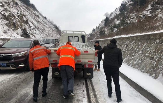 1月30日下午4时,该段皂郊养管站巡查车巡查至国道316线k2546+300米路段时,发现一辆小型货车被困在雪地里,车轮打滑导致车辆已经无法行驶,了解情况后,该站职工立即展开救援工作,一边做好来往车辆的交通指挥工作,一边帮助被困车辆安装防滑链,同时铲积雪、抛撒工业融雪剂,组织人员合力推车,经过半个多小时的救援,被困车辆终于顺利起步,安全通过此路段。
