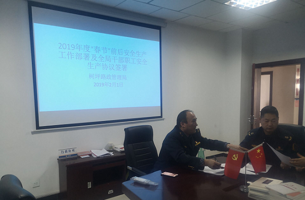 2019年2月1日,由党组书记、副局长哈斯木·买斯木同志组织全局干部职工召开柯坪路政管理局2019年度安全生产第一次工作例会暨防灾、减灾、抗灾工作会议并组织全体干部职工签订了《柯坪路政管理局交通安全承诺书》及《柯坪路政管理局消防安全承诺责任书》。会议召开及两项《责任书》的签订,有效的提升了柯坪路政管理局安全管理水平,进一步营造路政海事系统行业在春运期间积极向上的浓厚舆论氛围。彰显路政海事系统在春运期间“保路护航、执法为民”的行业形象。
