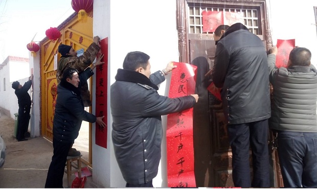 清风网讯 (通信员:拜城县住建局 李涛) “挂灯笼、贴对联”是中华民族过新年的传统习俗。为营造祥和、喜庆的春节氛围,2月1日,拜格其买里斯村“访惠聚”工作队在妥善准备的情况下,和拜城县住建局下沉干部、村干部之间相互配合,为全村175户村民挨家挨户贴上了福字和新春对联。村民伊利亚斯·麦麦提说:“春节是我们共同的节日,现在中央对我们新疆的扶持力度这么大,我们的生活也一天比一天好,我们要加倍珍惜现在的美好生活,我们要感党恩,跟党走,以实际行动做好民族团结和维护社会稳定工作。”