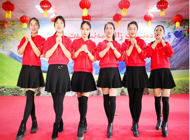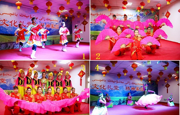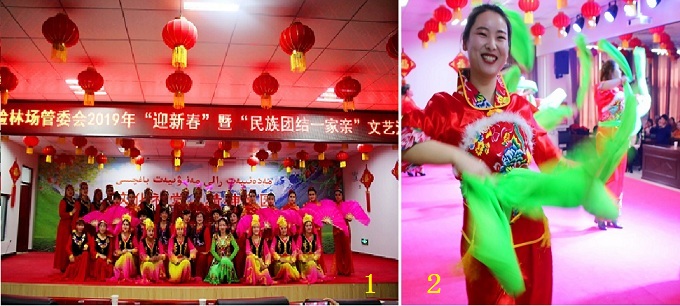 1、部分演员合影 2、阿克苏市档案局驻祥林社区工作队队员表演秧歌《火火的中国》