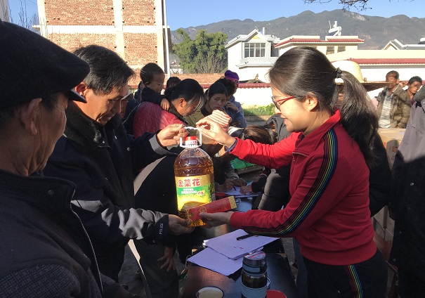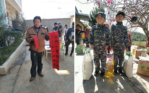 1月31日9:30,根据干马村19个小组分布情况,以村委会、郭家组活动场所、大寨活动场所为点分3个片区同步开展活动。一是进行明白人培训;二是作动员讲话,并送上节日的祝福;三是发放慰问品米、油、春联等春节慰问品。春联有成品赠送,也有现场撰写。一副副春联传达着来年暖暖的祝福,满满的笑容洋溢在送福、接福之人脸上,活动圆满结束。