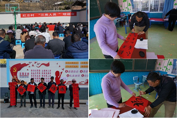 2月2日13:00,活动再次在营盘镇红立村进行。首先开展各小组长、大学生、返乡人员、驻村队员、村两委进行“三类人员”培训。营盘政府领导、村领导及医院领导分别进行了培训,并对人居环境提升工作中表现良好的小组、家庭、个人进行表彰;其次开展了“各类人员座谈会”,大家畅所欲言,为脱贫攻坚迎检冲刺出谋献策。现场同样派出医院职工到现场撰写春联并进行发放,保证家家户户都有一副春联,展现新年新气象。