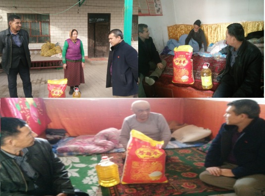 慰问人员首先来到四老人员库尔班·阿布拉家中嘘寒问暖,给他们送去了1袋大米和一壶清油,并带去节日的问候和祝福;村支部书记、联合支部副书记艾海提深情地说:你们老两口都是党员,在四老人员中身体是比较硬朗的一对,你们要保重身体、继续发挥余热,为农村稳定和村民致富奔小康献力。库尔班·阿布拉激动地说:谢谢党和政府对我们的关怀,我们将不忘初心,继续前行,为农村稳定和经济发展服务。