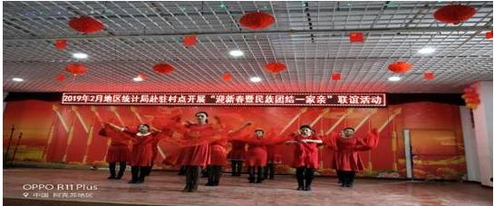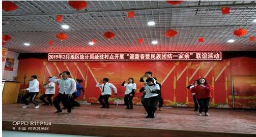 下沉干部与驻村工作队队员合唱了《团结就是力量》,将各族人民的心紧紧的联系到了一起,得到了村民们热烈掌声。联谊会结束时,地区统计局下沉干部、驻村干部和村民们共同跳起麦西来甫,共同欢快地迎接新年的到来。