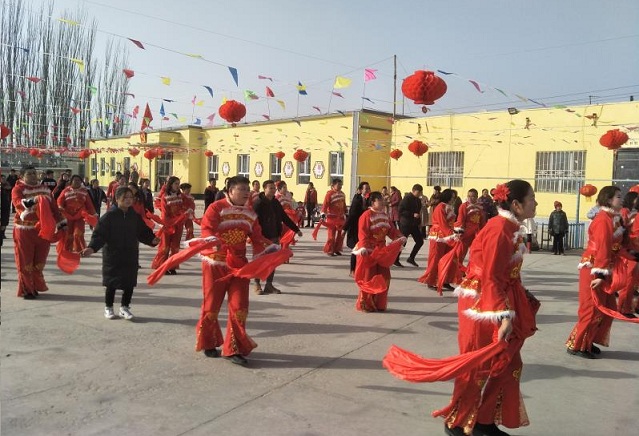 联谊活动在欢快的扭秧歌中拉开帷幕,教育局干部与村民在大道上敲着锣,打着鼓,扭着秧歌,精彩的表演传递着节日的祝福和喜庆,为和谐社会建设营造了浓厚氛围。栏杆村村民和教育局下沉干部共同合唱《没有共产党就没有新中国》、50多名村民自编自演了秧歌舞、现代舞,村民踩着十字步,舞着红绸带,跳出了陕北高原粗狂豪迈的风格,中华优秀传统文化悄然走进维吾尔族村庄。年轻村民跳起现代舞,全场透发着现代时尚气息,中华文化认同感在维吾尔族群众中得到进一步提升。