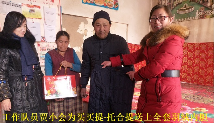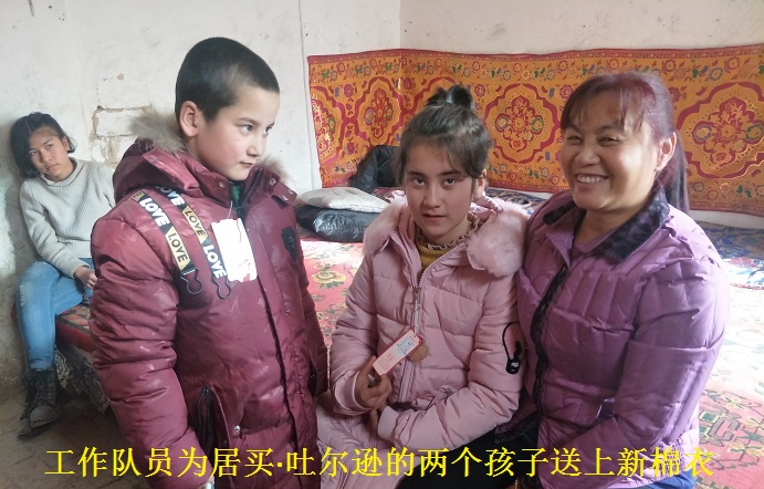 4组6号的买买提·托合提一家三口人,夫妻双方都患慢性疾病,丈夫高血压,肺病,妻子慢性妇科疾病,家里还有一个正在读书大学生女儿,虽然一家人全部享受低保政策,年人均收入在1万元以上,但是长期的看病吃药花去了不少钱,眼看该过春节了,他们夫妻两人也没有添一件新衣服,第一小队长贾小会看在眼里疼在心里,趁着轮休时间为他们夫妻买了过年穿的新棉衣,当买买提·托合提试穿他的新棉衣时禁不住流下了感激的泪水,他的妻子吾尔汗·买买提动情地说:“我们两个已经好多年没有添置过新衣服了, 太感谢你们了,政府的关心关爱让我看到了生活的希望,等我女儿参加了工作了,家里条件好了,也要帮助那些需要帮助的人”。