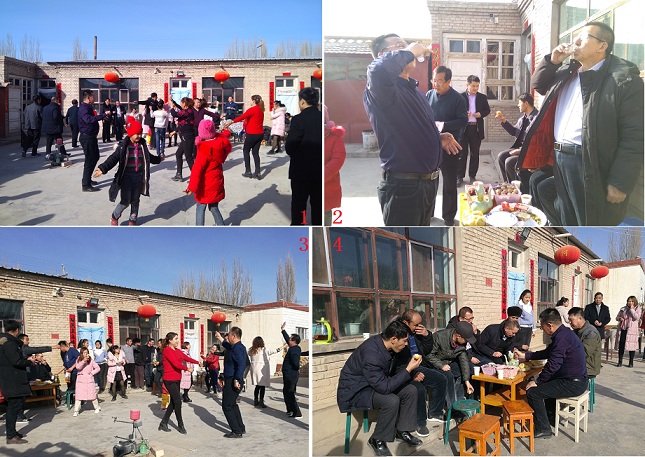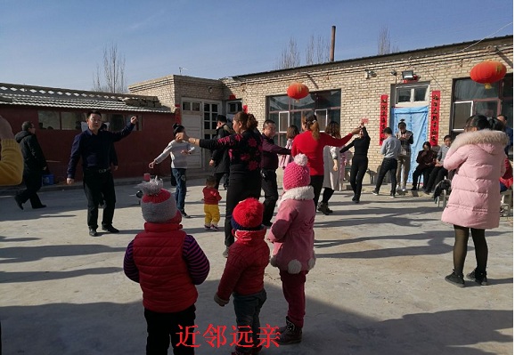 本村村民徐占华有九个兄弟姐妹,本分布在各地,一年甚至多年都无法相聚在一起。今年正月初一,各地兄弟姐妹齐聚在他家中,闻讯而来的邻居们用一句祝福、一句问候、一杯酒打开了话匣子,热情的邻里与远道的亲人熟络的攀谈起来。在主人的建议下,维吾尔族同胞们教他们跳起了麦西来普,欢快的舞步,爽朗的笑声回荡在徐占华家的院子中。