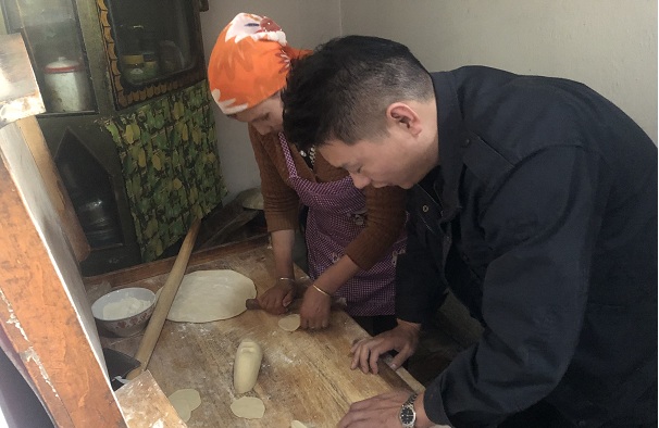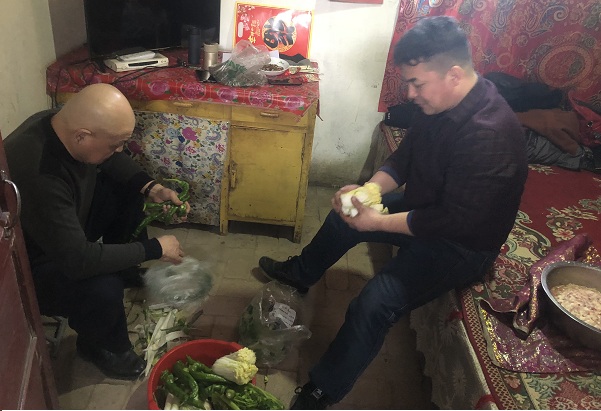 韩勇军检察长在他的亲戚阿布拉·努尔家里,一边用流利的维吾尔语与他们拉家常一边贴春联,气氛非常融洽。晚饭时,大家围坐在一起包饺子,韩勇军检察长说:“春节吃饺子是大吉大利,饺子形状像元宝,包饺子意味着包住福运,吃饺子象征生活富裕。”大家高兴地话村里的变化,谋新年的发展,叙浓浓真情。在走访期间,公诉科科长卡德尔·阿布力孜、法警队队长马学勤给困难大学生艾尔帕给了300元慰问金,鼓励他好好上大学,报答祖国、报答党。