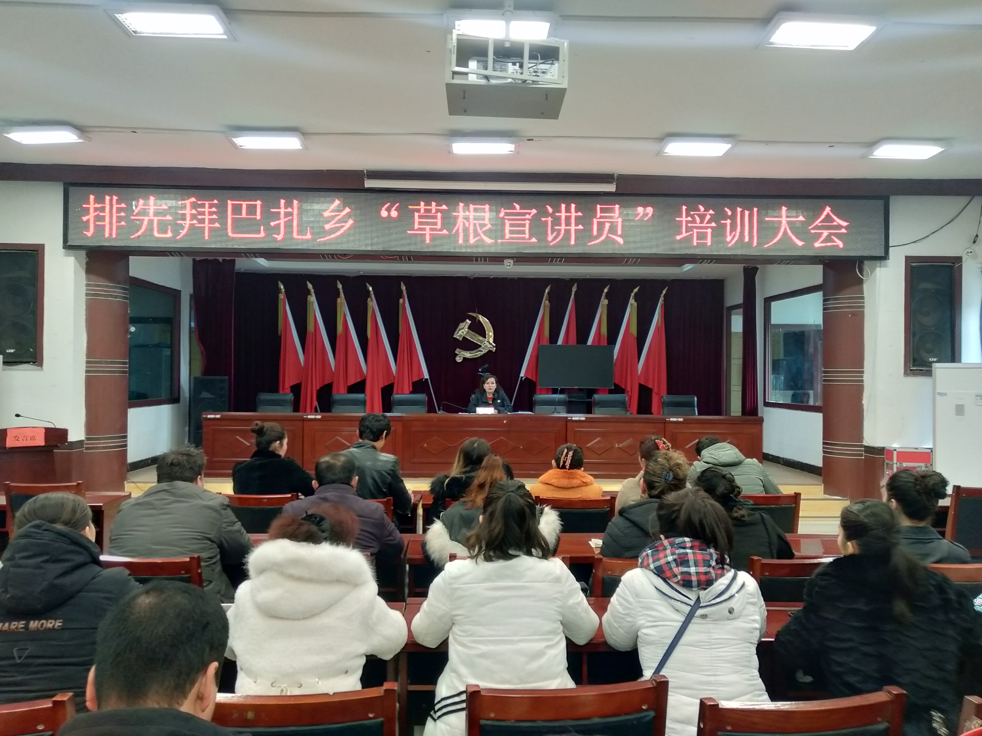 清风网讯(排先拜巴扎乡 阿孜古丽·艾买提 黄素平) 2月7日下午,排先拜巴扎乡在政府大会议室召开草根宣讲员专题培训班,乡党委委员、宣传干事阿娜尔古丽·阿皮孜主持,本乡草根宣讲员40余人参加此次会议。此次培训班旨在全力提升草根宣讲员整体水平,充分发挥“草根”宣讲员的积极作用。