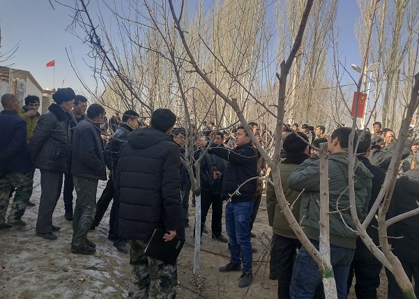 培训会上阿布都肉苏力·苏皮同志通过现场示范、指导、讲解的方式,详细解读了果树在修剪、嫁接、整形、施肥、病虫害防治方面的实用技术;着重围绕适合黑英山乡山区气候种植的林果业提出了建议性的方式方法,结合实际详尽解答了参会人员提出的疑惑。最后,现场会采取点评的方式对参训人员技术掌握情况进行考核。