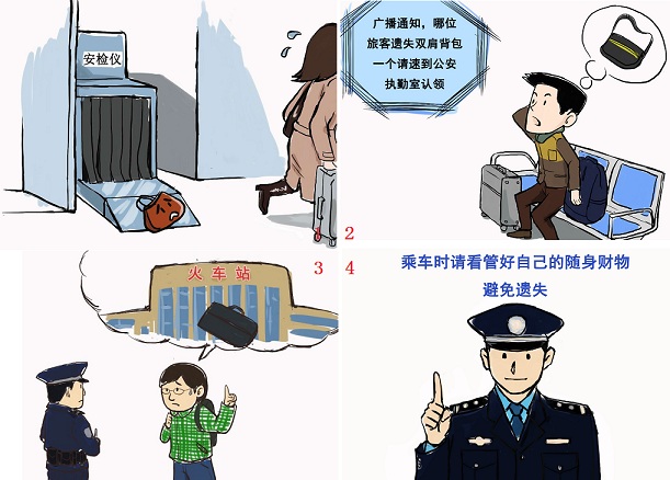针对旅客丢包的情况,呼和浩特铁路公安处民警颜屹成画出一组漫画温馨提醒广大乘车旅客:请提前出发,预留充足的够票进站时间,无论您在购票、取票,还是进站过安检,或是在候车室等车,请保管好自己的行李物品,尽量减少携带行李的件数,每次人物分离后都要检查行李件数再出发,以免将行李遗落造成不必要的麻烦或损失。当您发现自己的行李物品丢失后,请立即到车站公安执勤室或拨打报警电话报警。