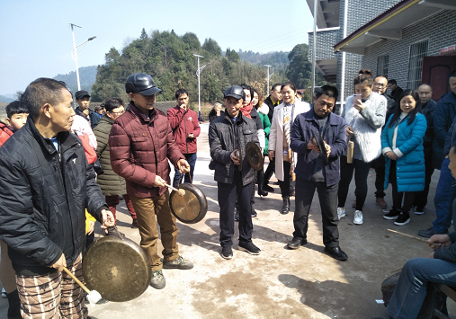 怀化凉亭坳乡贺家田村利溪组的闹年锣代表队前来助兴表演