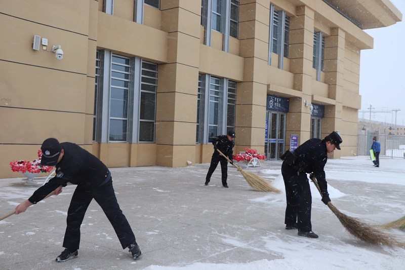 期间,民警配合车站客运部门及时清扫站前广场、站台以及站区其他重点部位积雪,并加强备勤处突力量,全力维护管内站车治安秩序,在动车组列车达到时刻,加强组织引导旅客正常乘降,确保旅客出行安全。