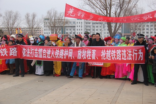 期间,民警联合各村镇秧歌队秧歌队深入街道、集市、广场等地,通过发放宣传册、悬挂条幅、现场演示等群众喜闻乐见的形式,面对面向沿线广大群众讲解护路防伤的重要意义和铁路交通事故典型案例等形式,告知其翻越护网横越线路、牲畜放牧进网等行为的危害性以及应承担的法律后果;并倡导广大农牧民朋友要配合派出所做好联防联控工作,自觉维护铁路运输安全,确保铁路治安安全稳定。通过此次宣传,起到良好效果。