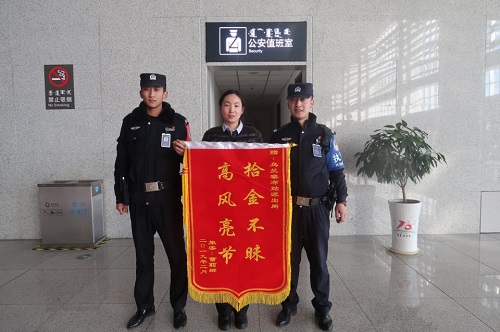 2月20日,丢包旅客返回乌兰察布站后,经民警核实确认,将灰色背包交还该旅客。旅客曹女士将一面写有“拾金不昧 高风亮节”的锦旗送到派出所,对民警的热心帮助表示感谢。