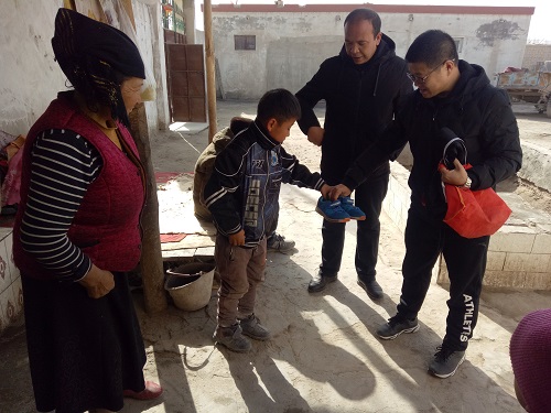 王宝义在入户走访时发现本村4小组低保户阿扎旦木·毛尼亚孜家家庭困难,孩子穿的棉衣上衣和裤子是又小又短,看上去也很不协调,鞋子也是又旧又烂,大母脚趾都快从烂的洞里钻出来了,看到此种情景王宝义心里酸酸的,感觉有说不出的滋味,心里面想马上开学了,孩子不能穿成这样上学呀,一定要为这孩子穿上一套新衣服,让他高高兴兴的去学校。于是他悄悄地在入户本子记下了孩子穿的鞋子的号码。